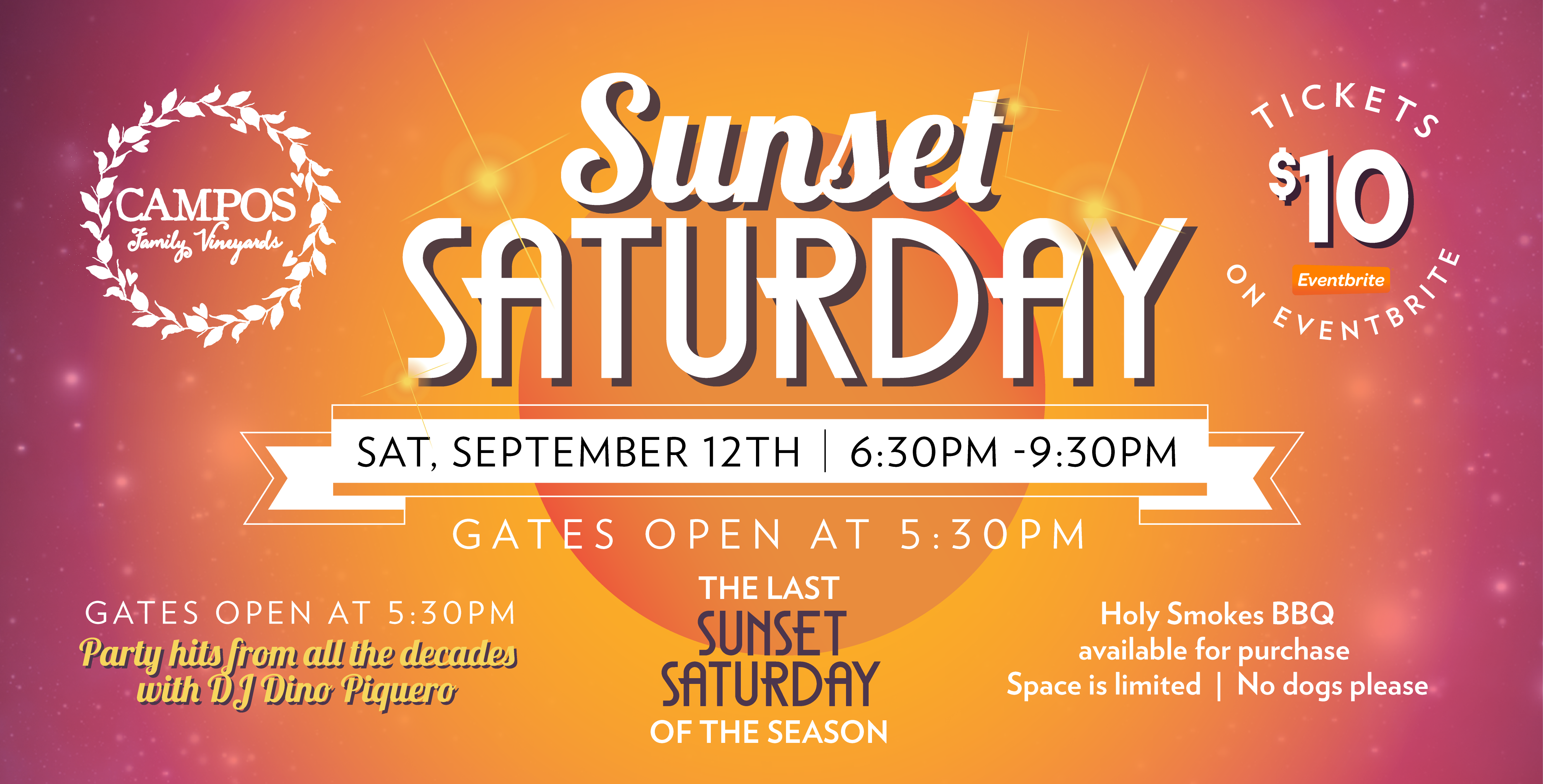 Join us THIS SATURDAY for an Intimate, limited seating Sunset Saturday!!! DJ Dino Piquero will be playing all of your Favorite PARTY Hits from EVERY DECADE! This will be OUR LAST SUNSET SATURDAY EVENT THIS SEASON!